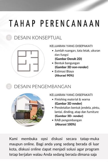 Proses Desain di Rancangbangun123 terdiri dari 2 tahap, yang masing2 tahapnya diperbolehkan 2x revisi, dalam setiap revisi biasanya kita akan memberikan beberapa opsi yang paling mungkin sesuai dengan kebutuhan Anda sebagai calon penghuni rumah. Tahap2 nya yaitu: